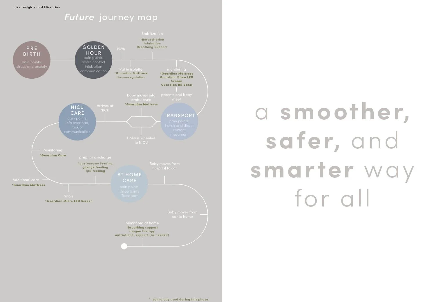 One of the most important parts of our research was developing an understanding of the NICU process in its entirety, focusing on the hospital staff, parents, and of course the baby. We created a timeline for each, highlighting areas along the journey that caused the most pain points, golden hour, transportation, and at home care.